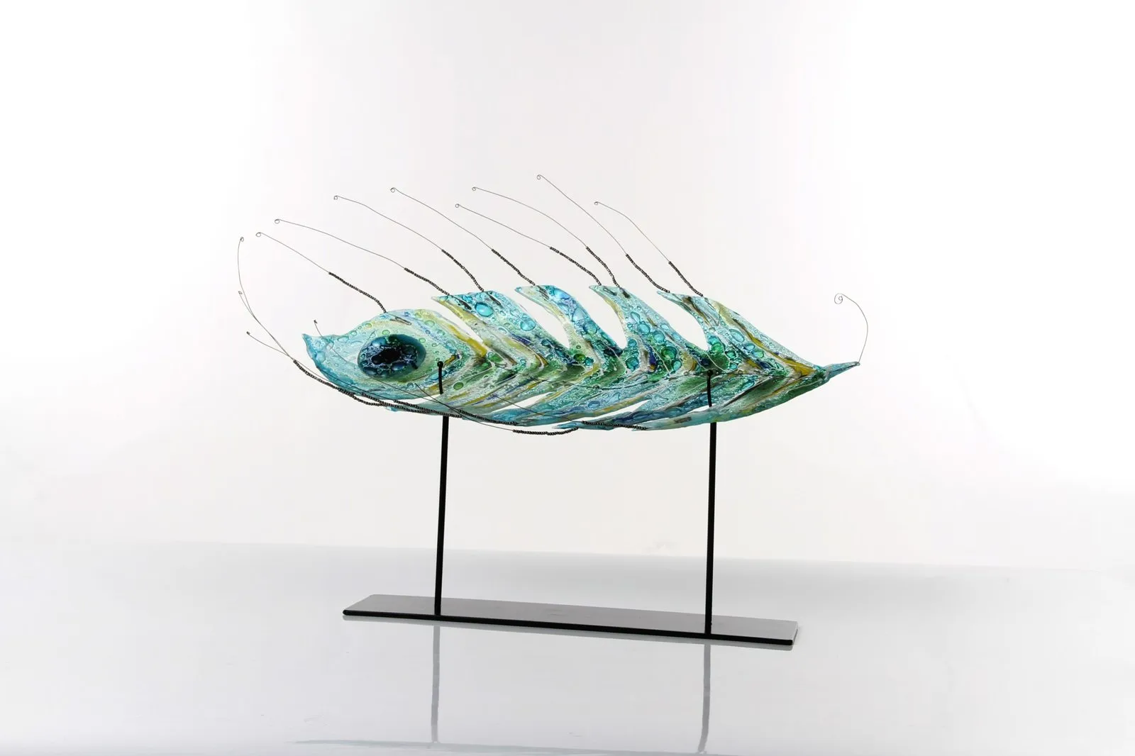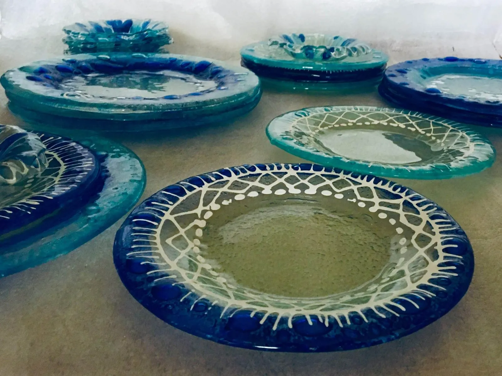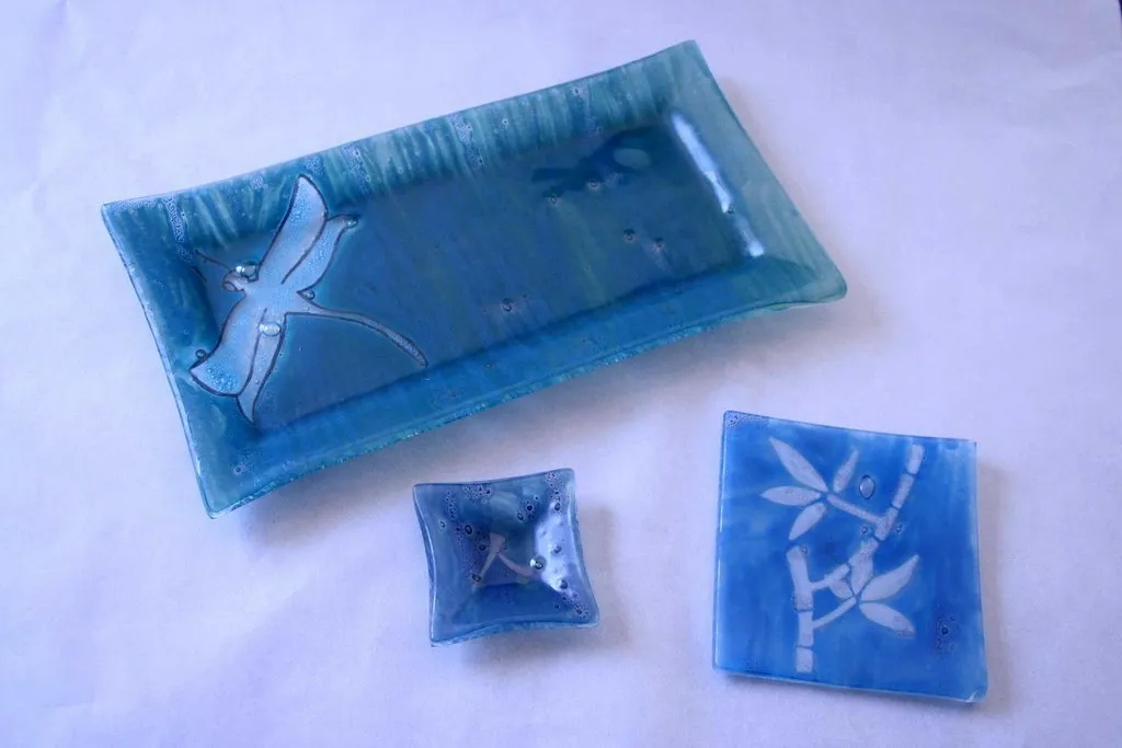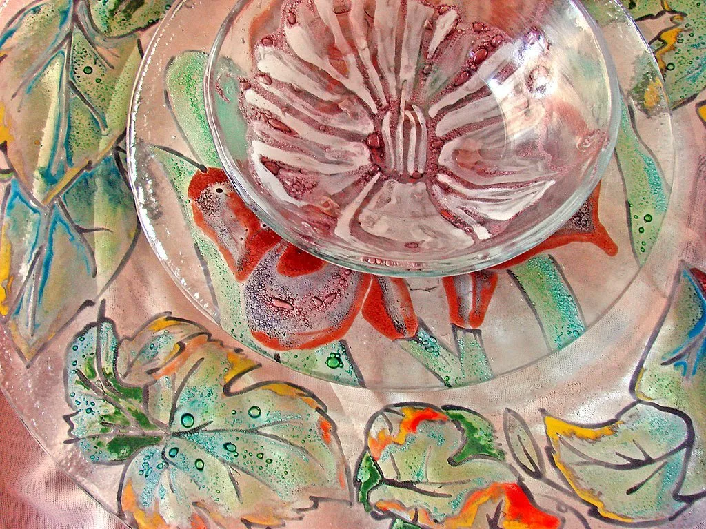Piezas en vidrio como vajillas y objetos únicos, elaborados con técnicas de fundido y modelado. Cada creación combina utilidad y diseño, mostrando la versatilidad del material en objetos cotidianos y distintivos.