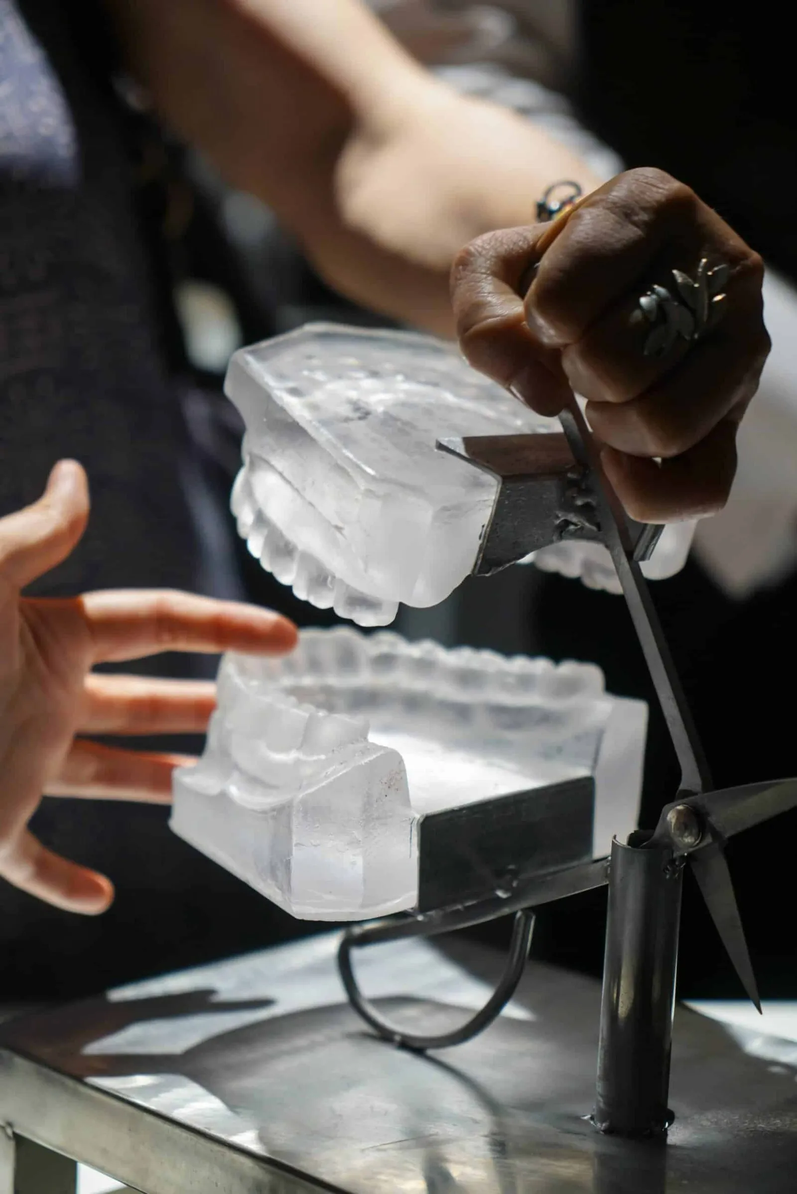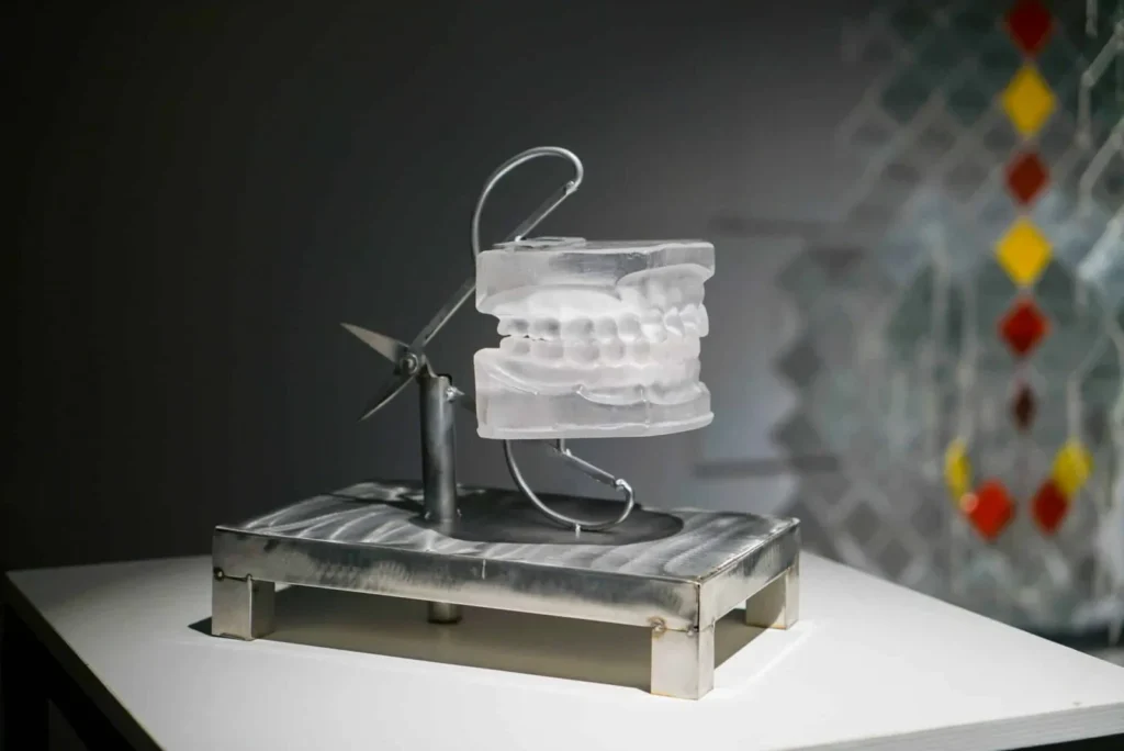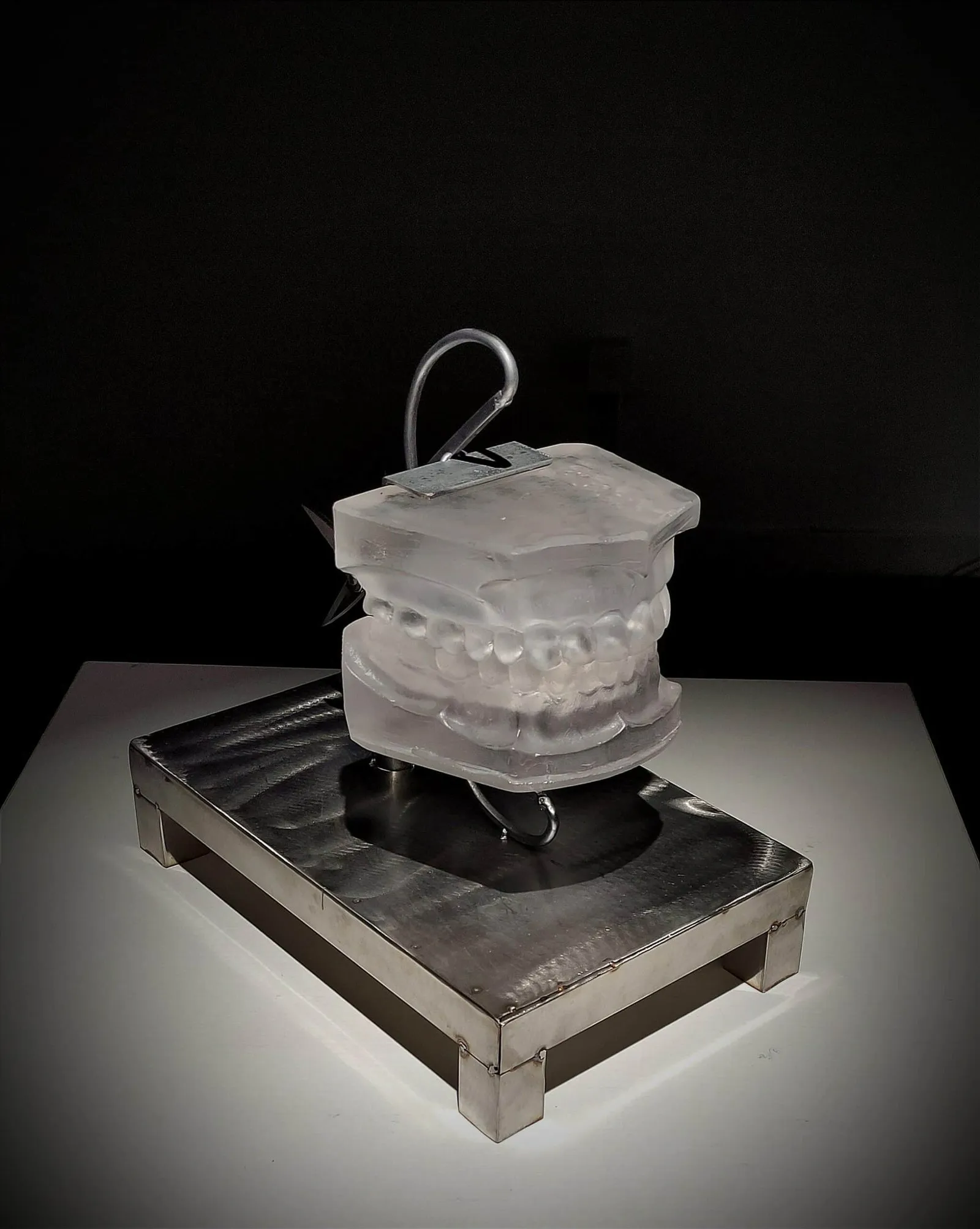 En Palabras que Cortan, el lenguaje se materializa como una dentadura en vidrio sobre estructura metálica. La boca se convierte en escenario de la violencia: un mismo término puede sanar o herir, dependiendo de la intención o del momento en que se pronuncia.